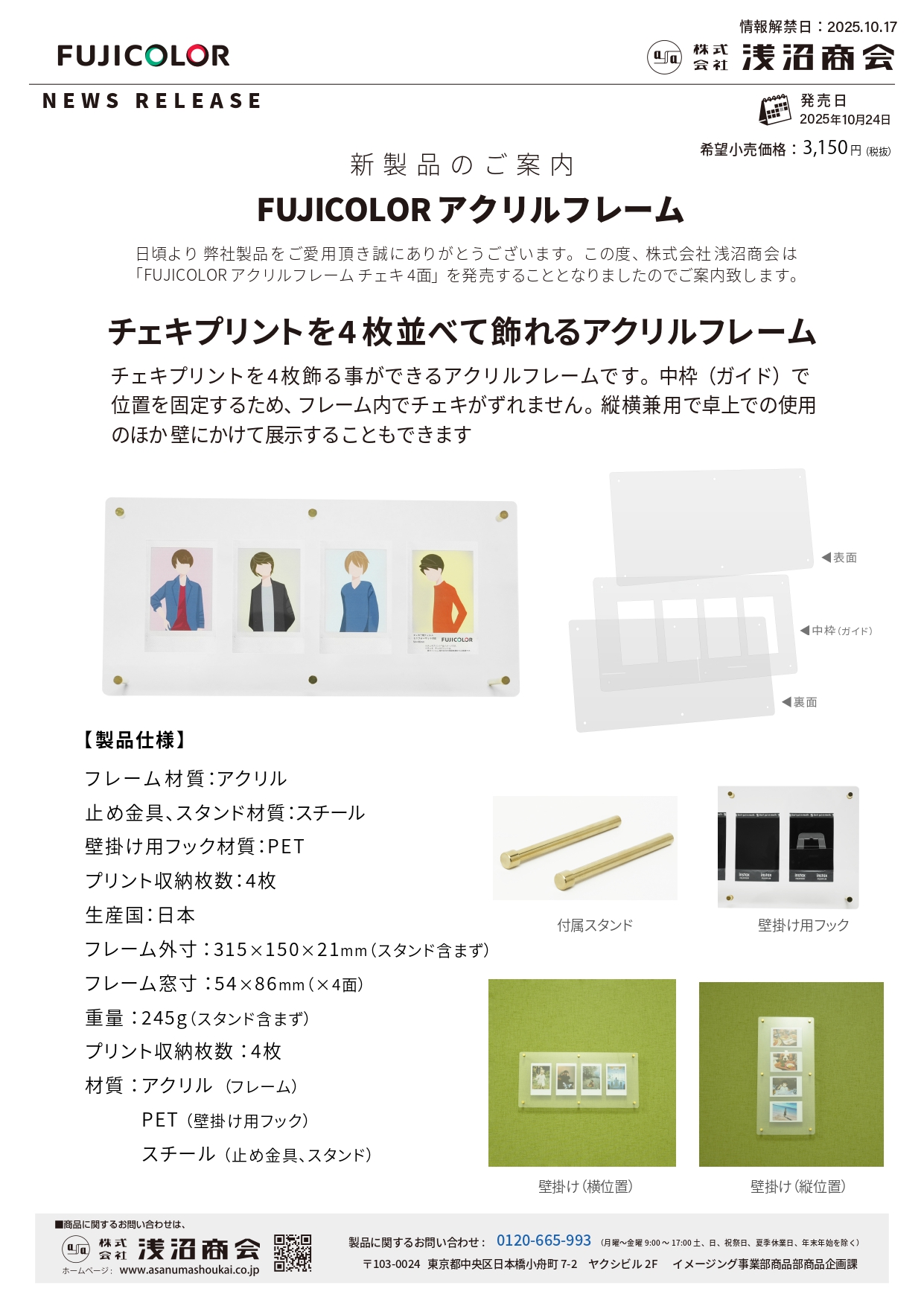 この度 浅沼商会は、FUJICOLOR アクリルフレーム チェキ4面を発売することとなりましたのでご案内いたします。(発売日:2025年10月24日)