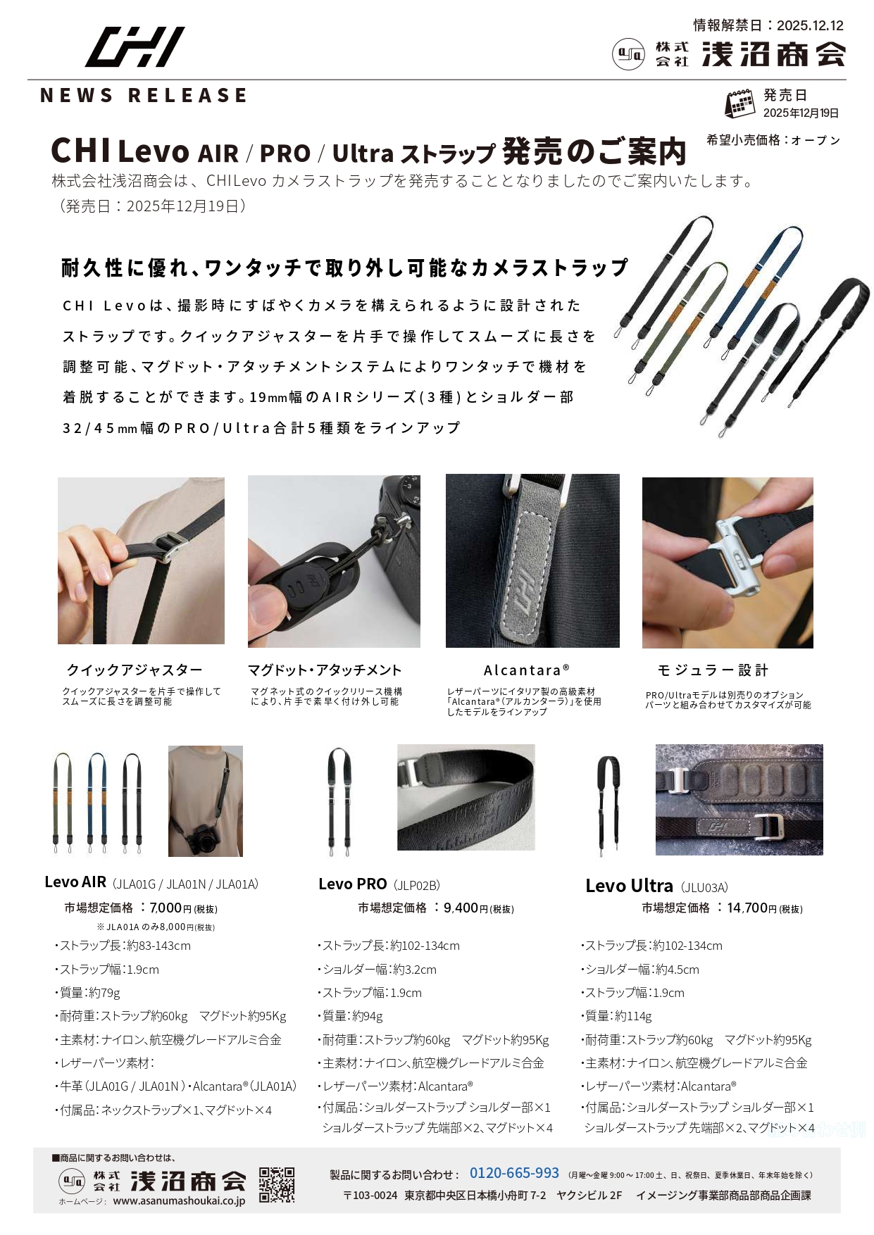 この度 浅沼商会は、CHI Levo- AIR / PRO / Ultra カメラストラップシリーズを発売することとなりましたのでご案内いたします。(発売日:2025年12月19日)