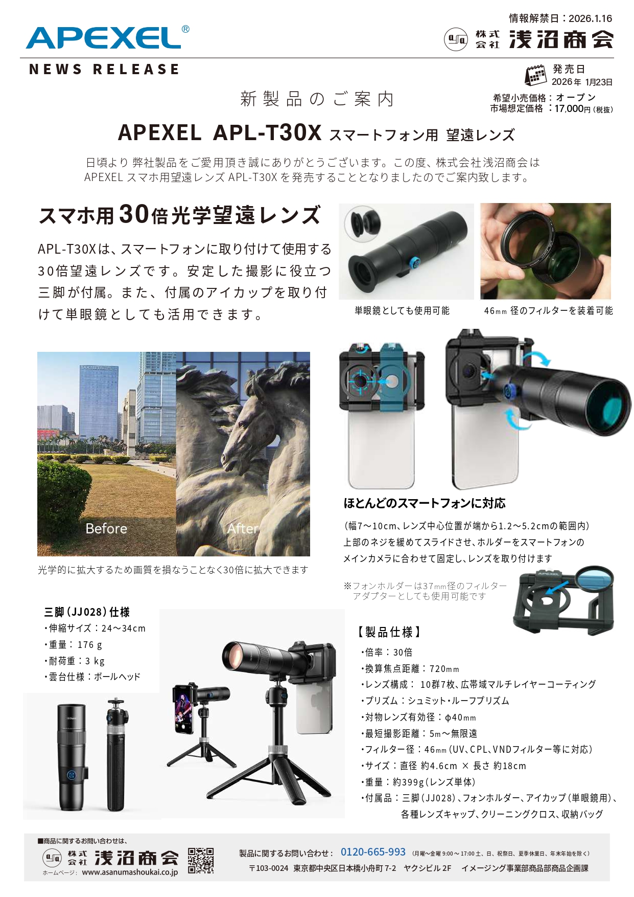 この度、株式会社浅沼商会はAPEXEL スマートフォン用望遠レンズ APL-T30X を発売することとなりましたのでご案内申し上げます。 (発売日:2026年1月23日 )