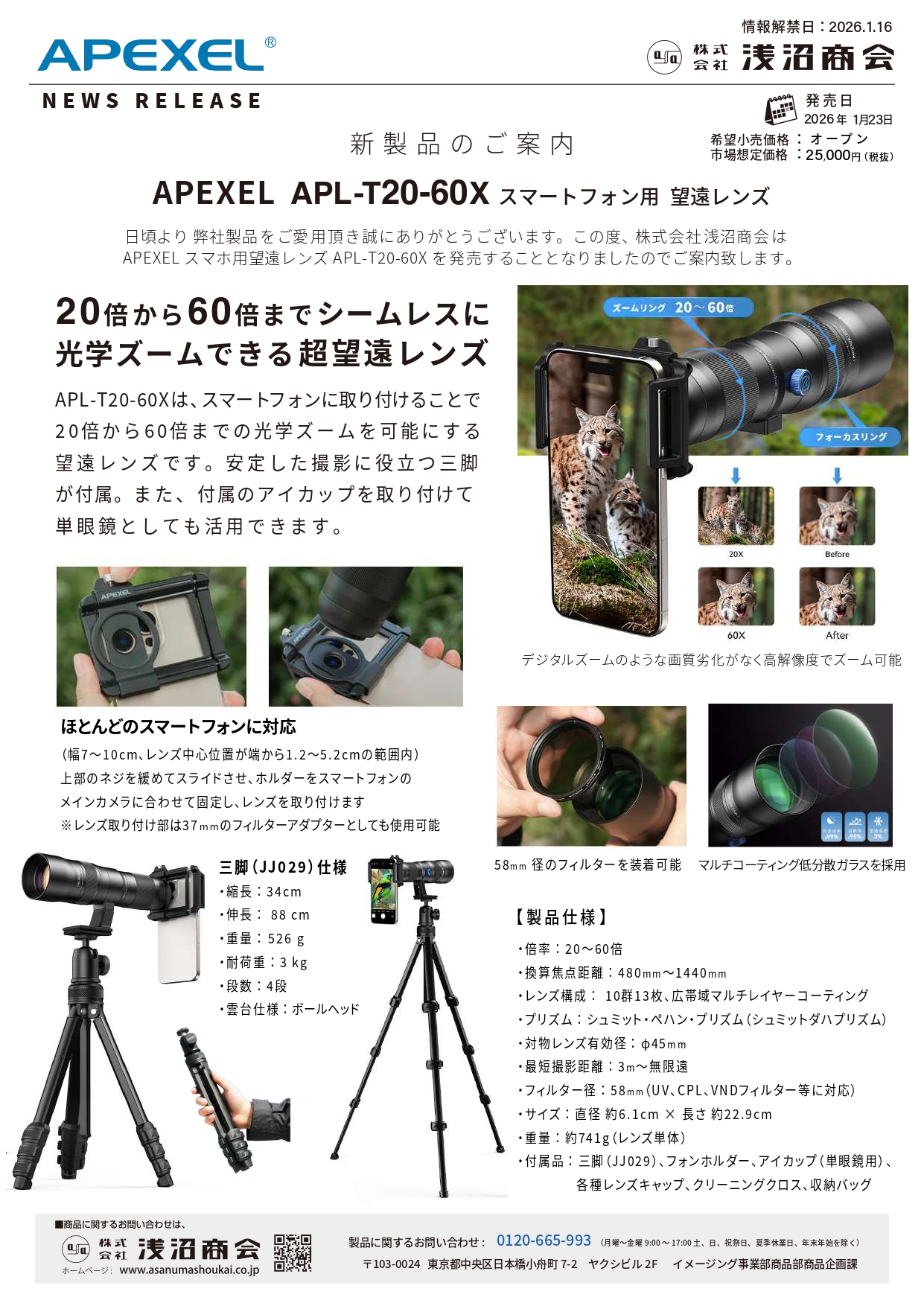 この度、株式会社浅沼商会はAPEXEL スマートフォン用望遠レンズ APL-T20-60X を発売することとなりましたのでご案内申し上げます。 (発売日:2026年1月23日 )