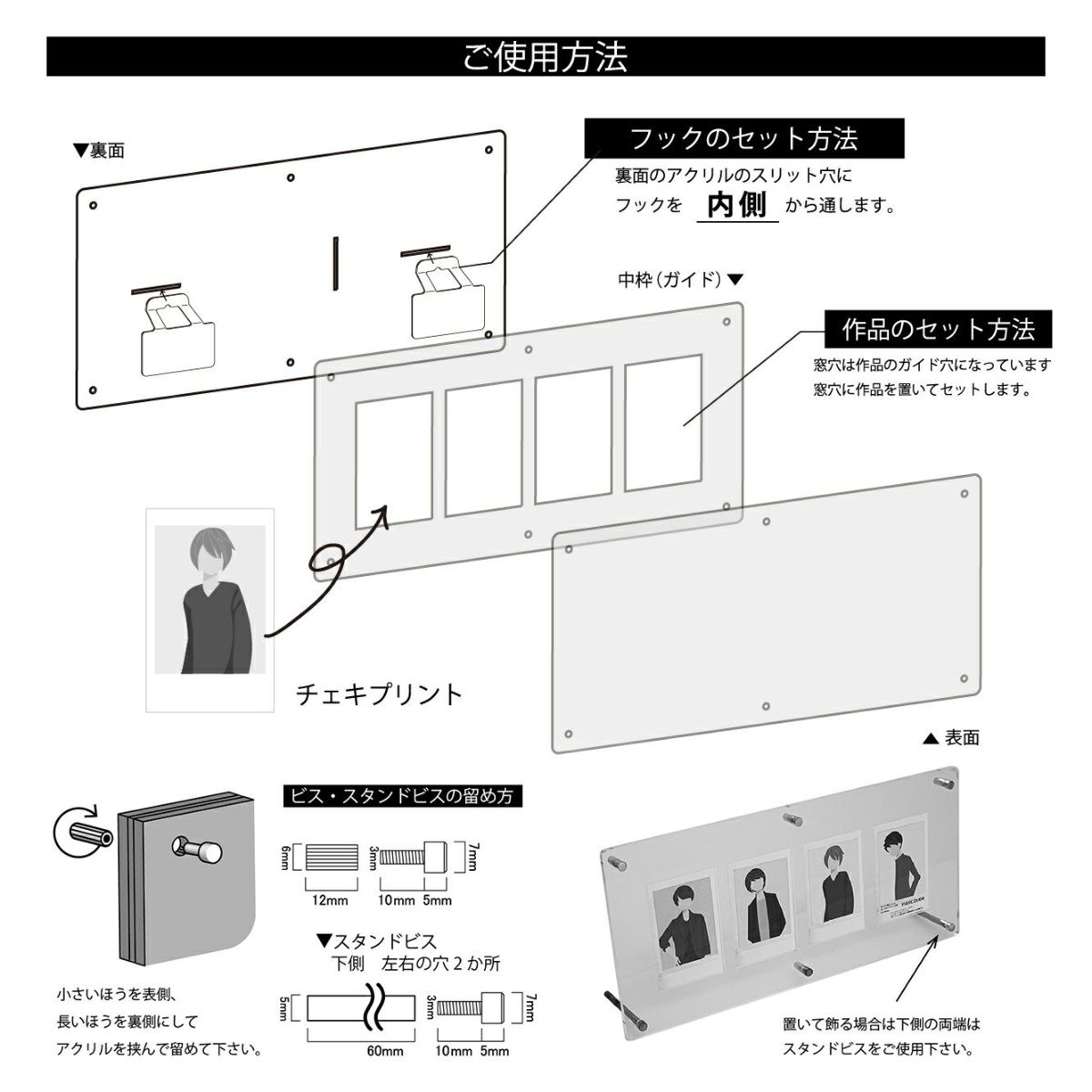 チェキプリントを4枚飾る事ができるアクリルフレームです。中枠(ガイド)で位置を固定するため、フレーム内でチェキがずれません。縦横兼用で置いて使うだけでなく、壁にかけて展示することもできます