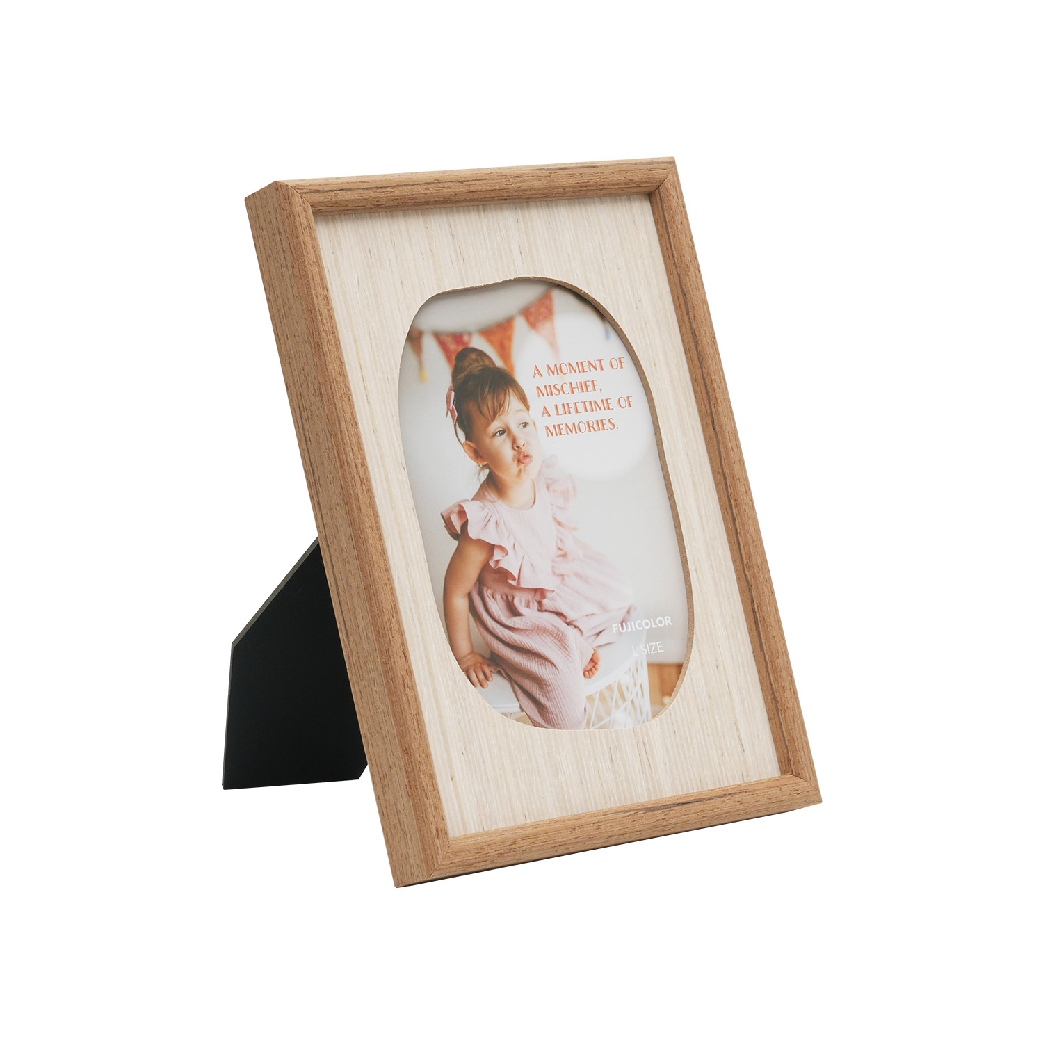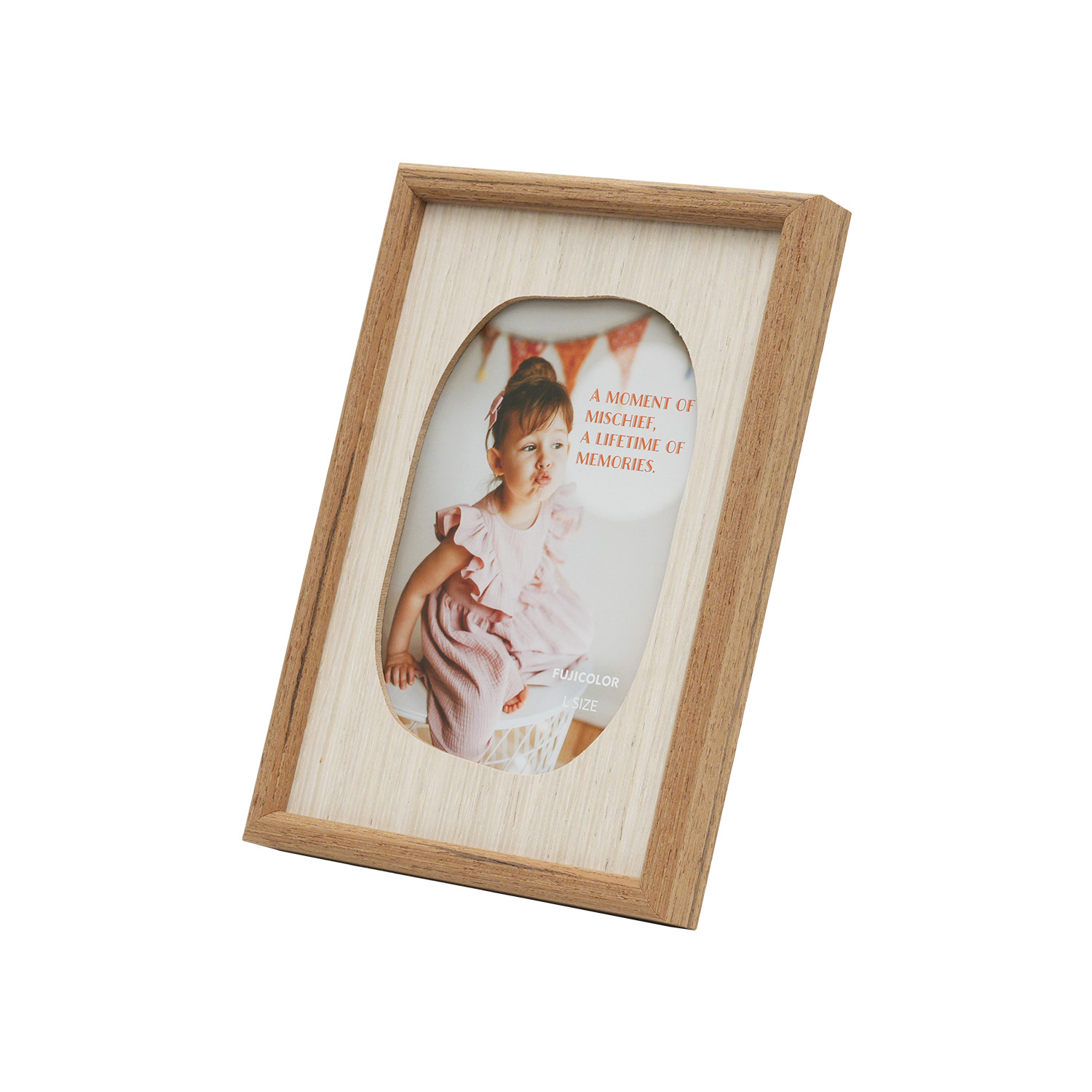 窓枠の形状がユニークな遊び心溢れる木製マットフレームFUJICOLOR ウッディフレームMellowは、温かみのある木製マットを採用、四角や楕円ではない、遊び心溢れる窓枠デザインが印象的な木製フレームです。吊金具付きで壁掛けにも対応