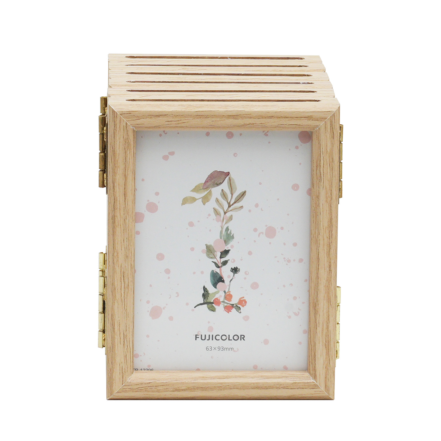 表裏の両面で写真を飾ることができるナチュラルな木製フレームフレーム上部のスリットへチェキ、ハーフサイズプリントを挟んだ透明な板を差し込むようにして収納し、表裏の合計12面に飾ることができます。使わないときには折りたたんでコンパクトに保管できます。写真以外にも切り抜きや押し花など、透け感を活かした飾り方も楽しめます。