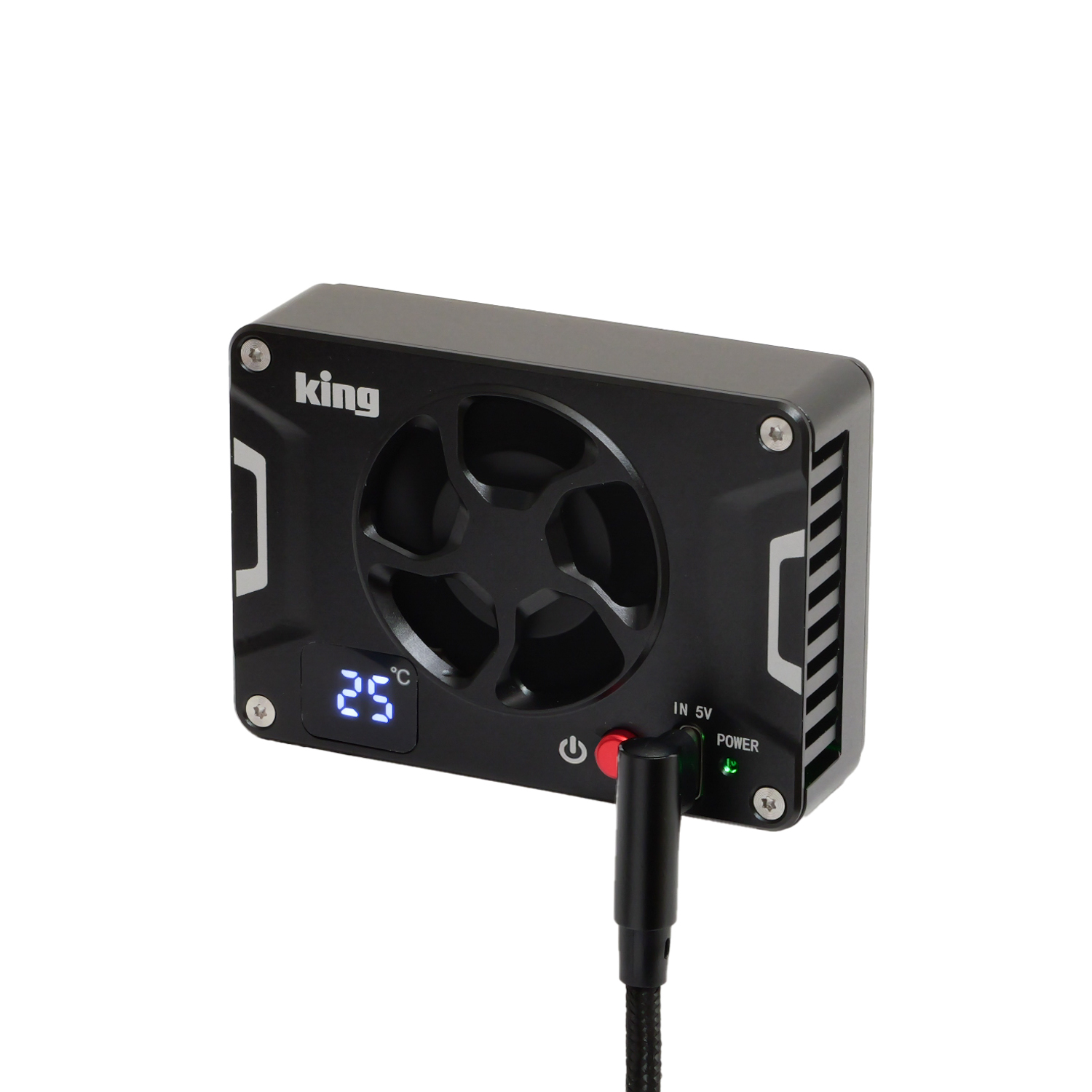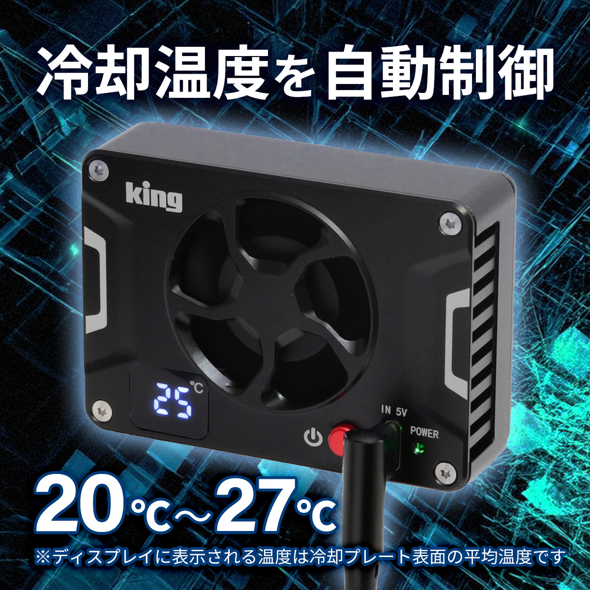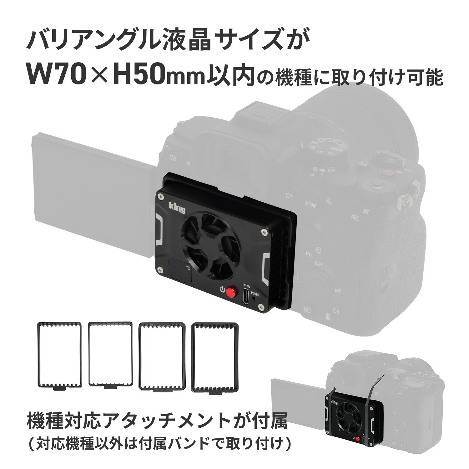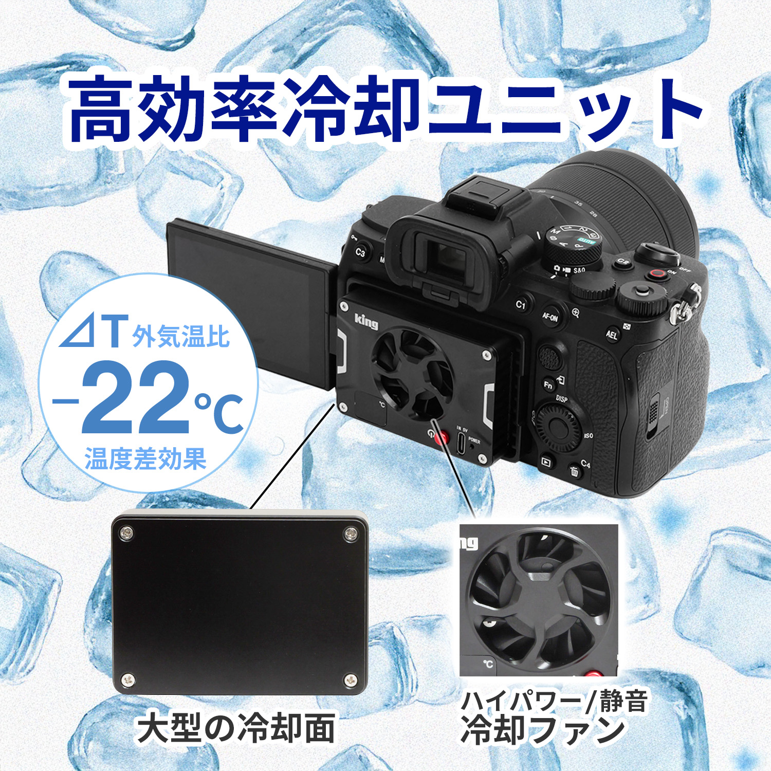 King PFH-02 カメラクーラーは、カメラのオーバーヒート対策に有効なアクセサリーです。発熱するカメラを効率的に冷やすことでイメージセンサーにかかる負担を軽減、炎天下での使用時や長時間の動画撮影時に発生する強制シャットダウンやセンサーノイズによる画質の低下を回避します。半導体冷却技術「ペルチェ式ユニット」の採用により高効率な冷却を実現しました。過冷却による結露の発生を防ぐため、冷却面の温度を20-27℃の間に自動制御するインテリジェンス仕様。